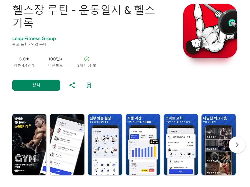 이 어플은 구글플레이스토어에서 "집에서 하는 운동"로 검색했을때 3번째로 나오는 어플입니다. 아래는 헬스장 루틴 - 운동일지 & 헬스 기록 어플에 대한 자세한 설명이니 참고하세요.
