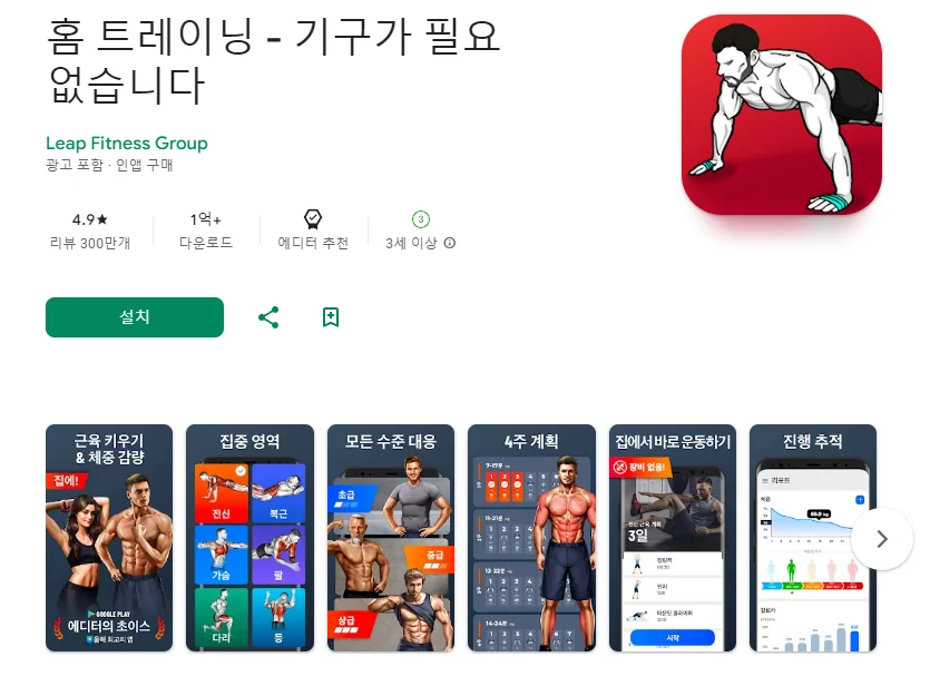 이 어플은 구글플레이스토어에서 "집에서 하는 운동"로 검색했을때 1번째로 나오는 어플입니다. 아래는 홈 트레이닝 - 기구가 필요 없습니다 어플에 대한 자세한 설명이니 참고하세요.
