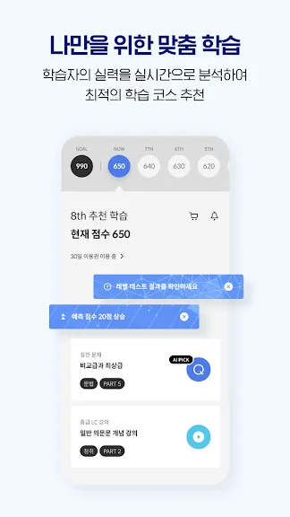 3분 만에 확인하는 내 점수와 파트별 취약점, 최신 경향이 반영된 8,000여 개 문제/450여 개 강의/1,000여 개 단어까지!