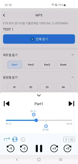 1. 실제 시험 성우가 녹음한 LC 음원 MP3 다운로드 및 앱 내 재생 기능 (속도 조절, 반복 청취)