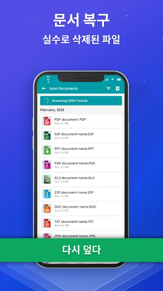 삭제된 사진 복구: 파일 복구. 삭제 된 파일 복구은 단순성과 효율성을 자랑스럽게 생각합니다. 스캔 버튼을 탭하기만 하면 장치나 SD 카드에서 삭제되거나 손실된 모든 파일에 대한 철저한 검색이 시작됩니다. 우리의 고급 파일 검색 알고리즘은 파일이 숨겨져 있거나 깊게 묻혀 있어도 눈에 띄지 않게 합니다.