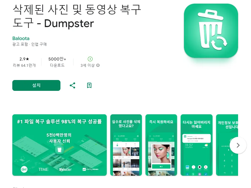 이 어플은 구글플레이스토어에서 "사진 복구방법"로 검색했을때 1번째로 나오는 어플입니다. 아래는 삭제된 사진 및 동영상 복구 도구 - Dumpster 어플에 대한 자세한 설명이니 참고하세요.