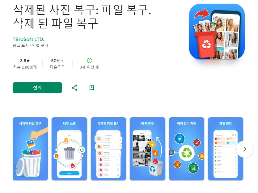 이 어플은 구글플레이스토어에서 "사진 복구방법"로 검색했을때 4번째로 나오는 어플입니다. 아래는 삭제된 사진 복구: 파일 복구. 삭제 된 파일 복구 어플에 대한 자세한 설명이니 참고하세요.