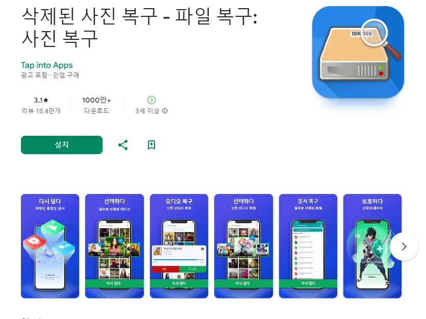 아래는 삭제된 사진 복구, 파일 복구, 모두 복구 어플에 대한 스크린샷 정보입니다.