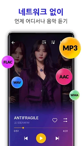 뮤직 플레이어는 단순한 MP3 플레이어가 아닌 MP3, MIDI, WAV, FLAC, AAC, APE 등의 모든 음악 및 오디오 형식을 지원하며 고품질로 재생합니다.