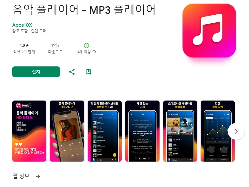 아래는 음악 플레이어 - MP3 플레이어 어플에 대한 스크린샷 정보입니다.