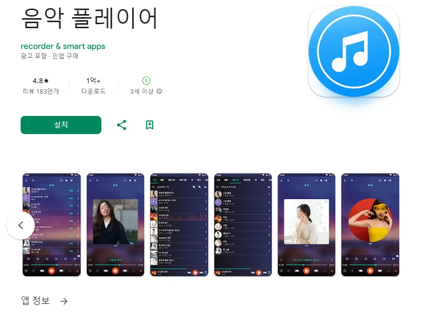 이 어플은 구글플레이스토어에서 "음악 플레이어"로 검색했을때 2번째로 나오는 어플입니다. 아래는 음악 플레이어 어플에 대한 자세한 설명이니 참고하세요.