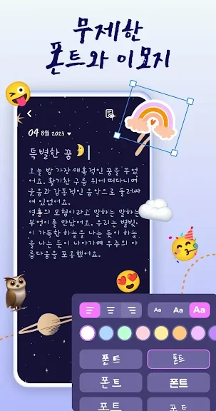 저희는 무제한 내용 편집 옵션, 사진, 이모지, 기분 등을 제공합니다. 또한, 사용자는 세련된 글꼴과 배경으로 내용을 장식할 수 있습니다.