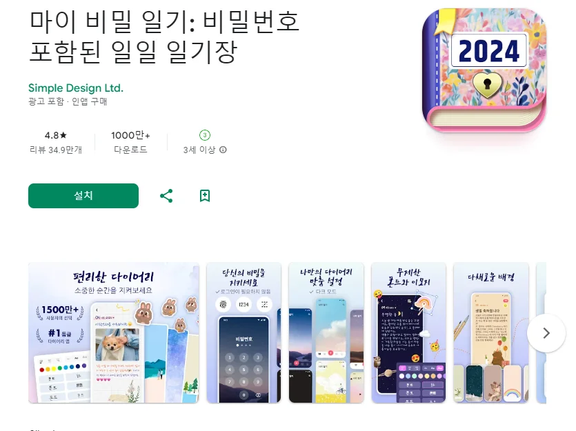 이 어플은 구글플레이스토어에서 "다이어리"로 검색했을때 1번째로 나오는 어플입니다. 아래는 마이 비밀 일기: 비밀번호 포함된 일일 일기장 어플에 대한 자세한 설명이니 참고하세요.