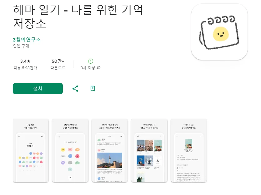 이 어플은 구글플레이스토어에서 "다이어리"로 검색했을때 3번째로 나오는 어플입니다. 아래는 해마 일기 - 나를 위한 기억 저장소 어플에 대한 자세한 설명이니 참고하세요.