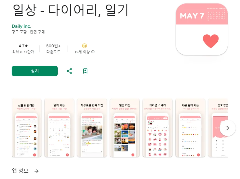 이 어플은 구글플레이스토어에서 "다이어리"로 검색했을때 4번째로 나오는 어플입니다. 아래는 일상 - 다이어리, 일기 어플에 대한 자세한 설명이니 참고하세요.