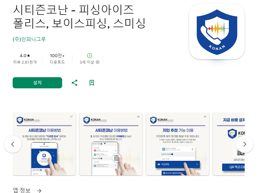 이 어플은 구글플레이스토어에서 "보이스 피싱 예방"로 검색했을때 1번째로 나오는 어플입니다. 아래는 시티즌코난 - 피싱아이즈 폴리스, 보이스피싱, 스미싱 어플에 대한 자세한 설명이니 참고하세요.