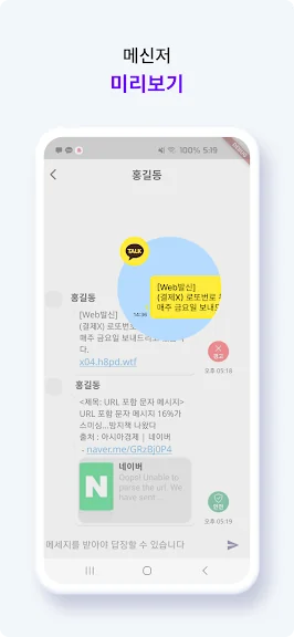 보이스피싱 및 해킹으로 이어질 수 있는 악성 IP/URL이 포함된 메시지, 가족과 지인을 사칭하는 메시지 등 보이스피싱에 활용되는 문자를 탐지하여 알림 제공합니다.