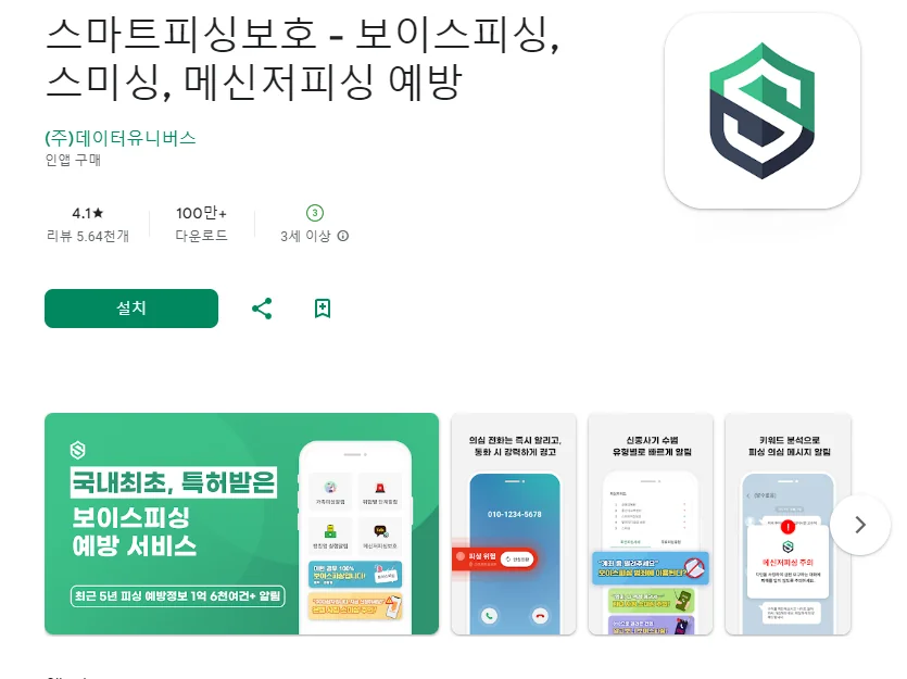 이 어플은 구글플레이스토어에서 "보이스 피싱 예방"로 검색했을때 3번째로 나오는 어플입니다. 아래는 스마트피싱보호 - 보이스피싱, 스미싱, 메신저피싱 예방 어플에 대한 자세한 설명이니 참고하세요.