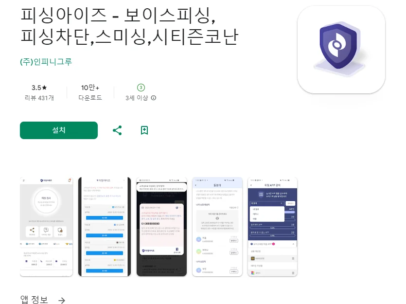 아래는 피싱아이즈 - 보이스피싱,피싱차단,스미싱,시티즌코난 어플에 대한 스크린샷 정보입니다.