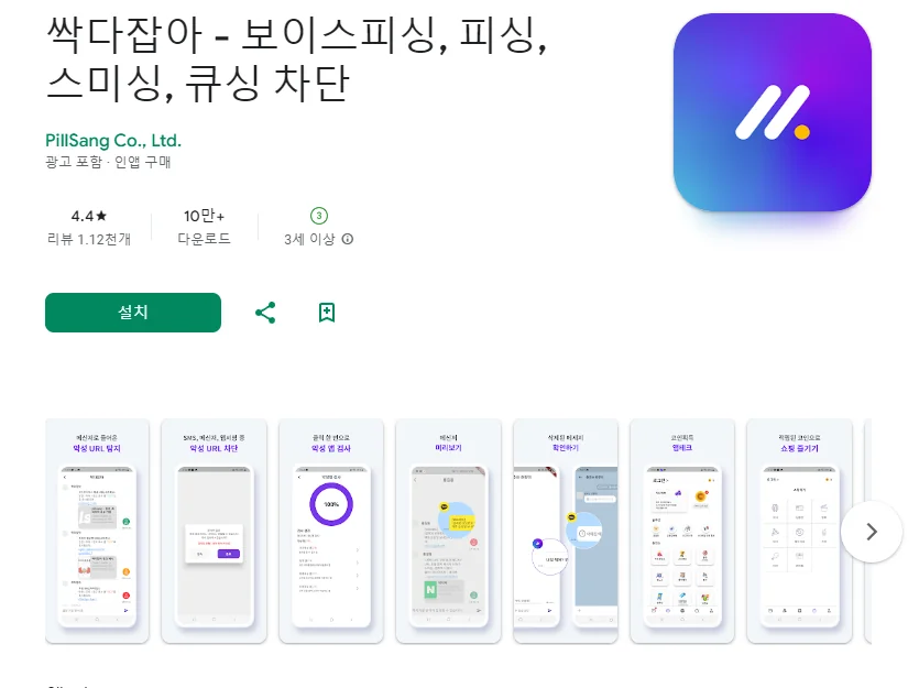 이 어플은 구글플레이스토어에서 "보이스 피싱 예방"로 검색했을때 4번째로 나오는 어플입니다. 아래는 싹다잡아 - 보이스피싱, 피싱, 스미싱, 큐싱 차단 어플에 대한 자세한 설명이니 참고하세요.