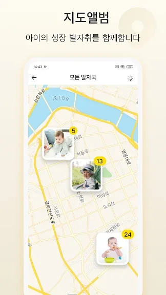 아기의 성장 및 발달 과정을 마일스톤을 통해 볼 수 있으며 지도에서 아기의 여정을 확인할 수 있습니다.