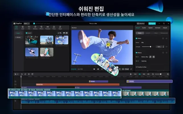 모자이크, 자동자막, 무음 구간 삭제, 배경제거, 트래킹, PIP, 키프레임, 이펙트, 오디오 효과 등의 고급 기능도 준비되어 있습니다.