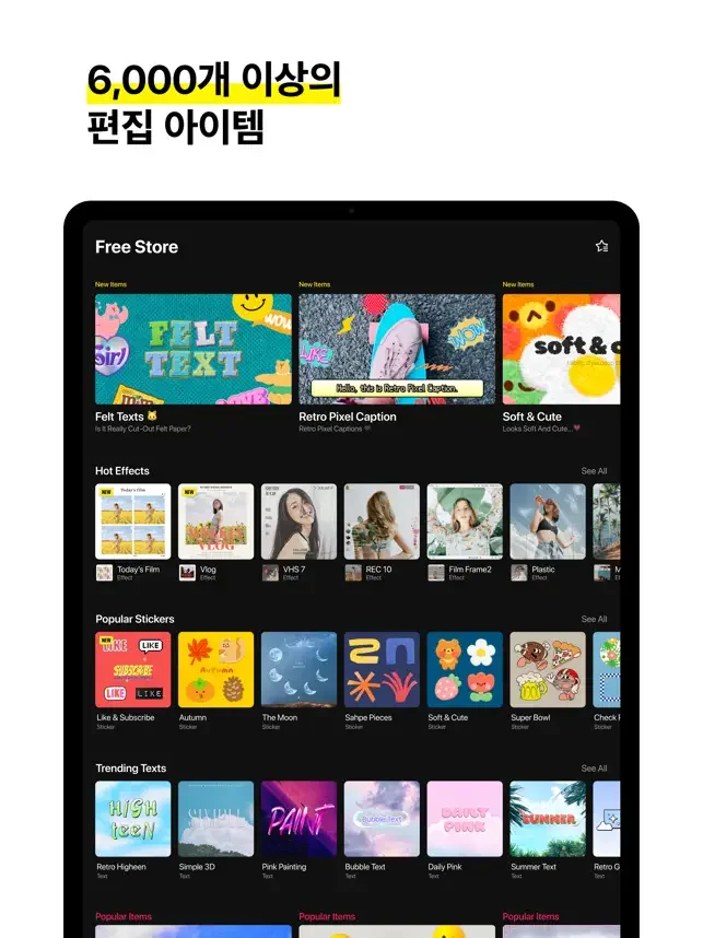 + 5,000개 이상의 트렌디한 주제별 스티커와 움직이는 텍스트가 주기적으로 업데이트 됩니다.