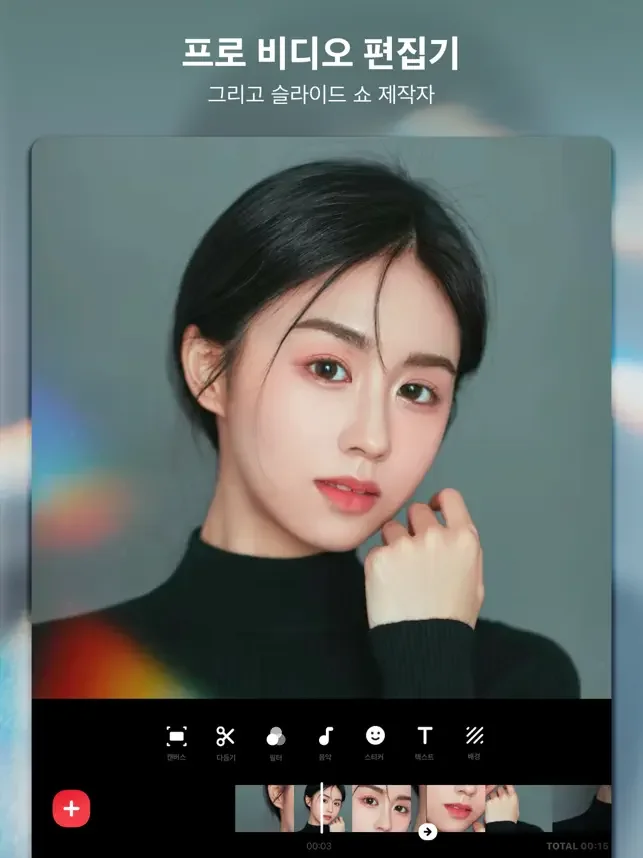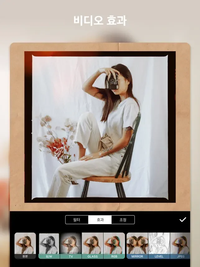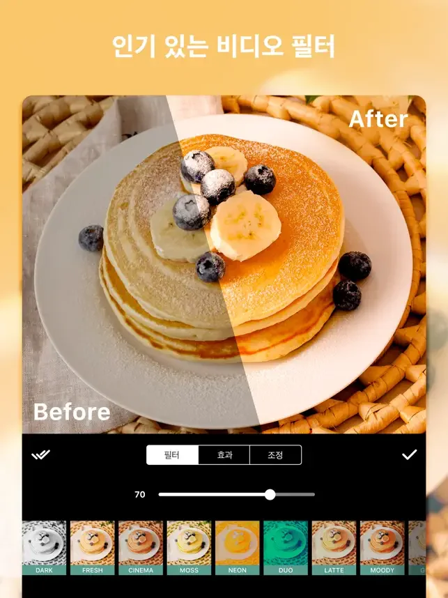 + 다양한 필터와 보정으로 세련된 영상의 느낌을 연출해보세요. 밝기, 콘트라스트, 채도, 색조, 그림자 등 디테일한 보정을 지원합니다.