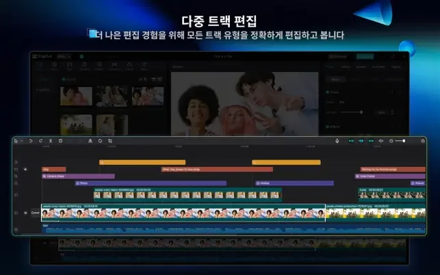 레이어 기반의 동영상 편집! 자유롭게 비디오와 각종 효과, 텍스트, 이미지 등을 추가하고 순서를 선택하세요
