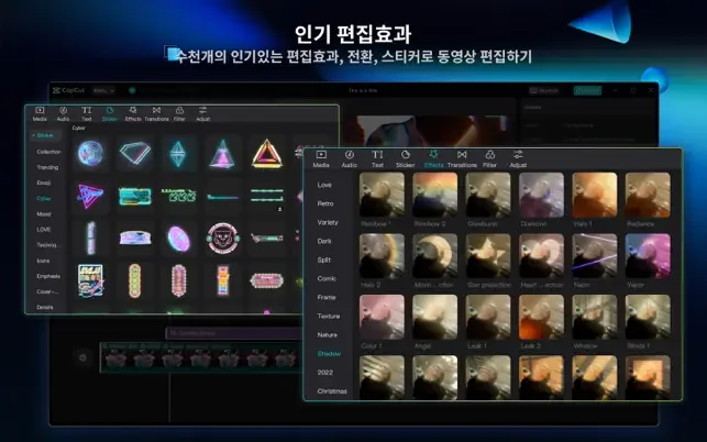 • 글리치, 블러, 3D 등 수백 개의 트렌드 효과가 있는 동영상을 편집합니다.