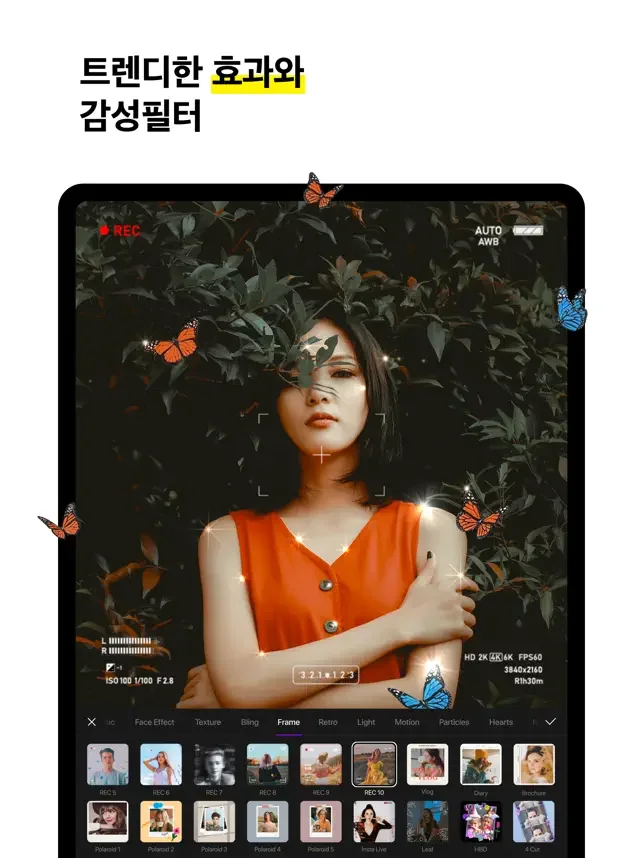 • REC 프레임, 손그림 프레임, SNS UI 프레임 등의 트렌딩 이펙트