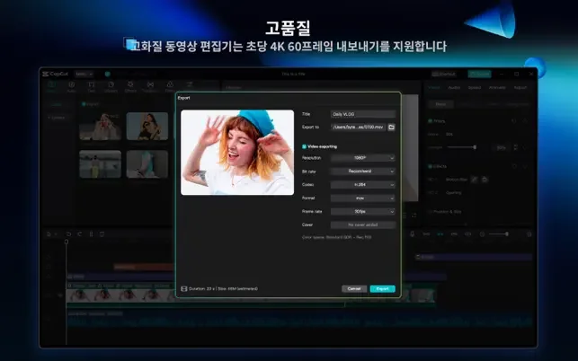 • 사용자 지정 동영상 내보내기 해상도, HD 동영상 편집기가 4K 60fps 내보내기, 스 트 HDR 등을 지원합니다.