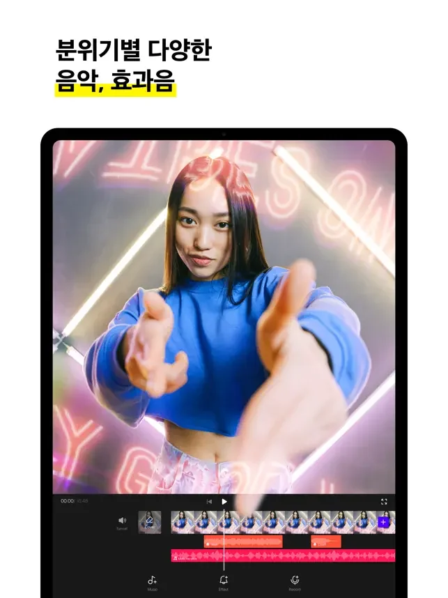 컷분할, 자막, 스티커, 배경음악, 효과음 및 트랜지션 등을 사용해 자유롭게 원하는 영상을 연출해보세요.