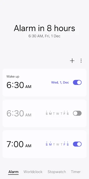 다른 안드로이드용 알람 시계와 달리 심플 알람은 알람이 다음 번에 울릴 순서대로 정렬되므로 심플 알람을 해야 할 작업 목록으로 사용할 경우 다음에 수행해야 할 작업을 쉽게 식별할 수 있습니다.