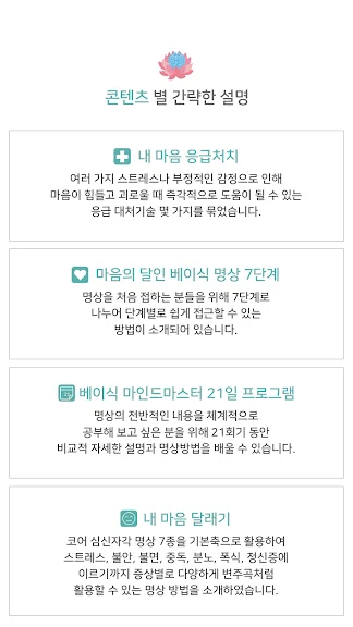 이 어플은 구글플레이스토어에서 "마음의 위로"로 검색했을때 2번째로 나오는 어플입니다. 아래는 마음의달인 - MindMaster 어플에 대한 자세한 설명이니 참고하세요.