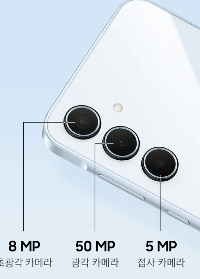갤럭시 A35는 총 4개의 카메라 렌즈를 탑재하여 다양한 촬영 경험을 제공합니다. 메인 카메라는 5000만 화소로 고화질 사진을 찍을 수 있으며, 800만 화소의 초광각 카메라는 넓은 풍경이나 단체 사진 촬영에 이상적입니다. 또한, 500만 화소의 매크로 렌즈는 가까운 거리의 피사체를 섬세하게 담아내며, 1300만 화소의 전면 카메라는 선명한 셀피 촬영에 적합합니다.