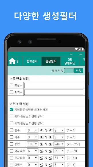 이 어플은 대한민국 동행복권(lotto645)을 기준으로 데이터를 제공하며, 로또 당첨 여부는 반드시 로또 판매점에서 확인해야 합니다. 필터 기능을 통해 자신만의 번호 선택 방식을 구현할 수 있으며, 더욱 스마트한 로또 생활을 경험할 수 있습니다.