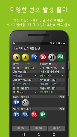 이 어플은 대한민국 동행복권(lotto645)을 기준으로 데이터를 제공하며, 로또 당첨 여부는 반드시 로또 판매점에서 확인해야 합니다. 필터 기능을 통해 자신만의 번호 선택 방식을 구현할 수 있으며, 더욱 스마트한 로또 생활을 경험할 수 있습니다.