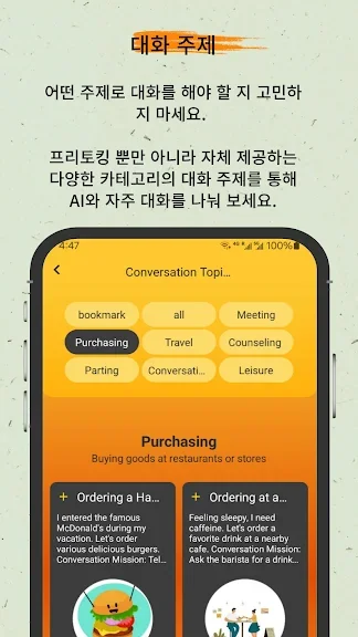 이 어플의 가장 큰 추천 이유는 AI의 자연스러운 발음과 음성 인식 기술입니다. 원어민과 대화하는 것 같은 경험을 제공하며, 12단계로 세분화된 수준 설정을 통해 모든 학습자에게 최적의 학습 환경을 제공합니다.