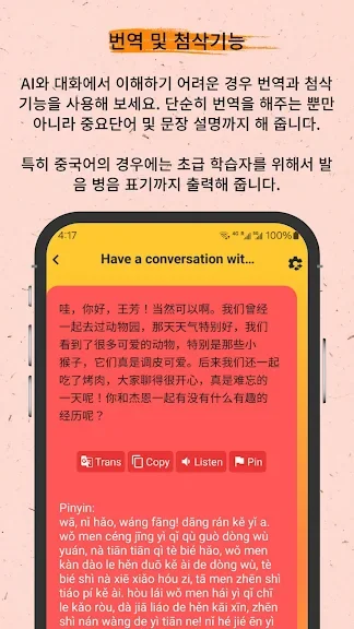 어플의 주요 장점은 무엇보다도 체계적인 훈련 시스템과 최첨단 음성 인식 기능입니다. 이를 통해 사용자는 실시간 발음 교정을 받을 수 있으며, 현지 원어민 발음을 직접 체험할 수 있습니다. 게다가 수준별 스토리와 원어민 동영상은 실제 중국어 사용 환경을 간접적으로 경험할 수 있는 기회를 제공합니다.