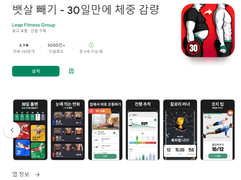 이 어플은 구글플레이스토어에서 "뱃살빼기 체중감량"로 검색했을때 1번째로 나오는 어플입니다. 아래는 뱃살 빼기 - 30일만에 체중 감량 어플에 대한 자세한 설명이니 참고하세요.