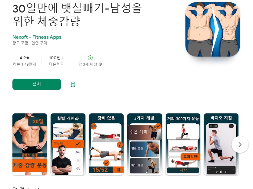 이 어플은 구글플레이스토어에서 "뱃살빼기 체중감량"로 검색했을때 3번째로 나오는 어플입니다. 아래는 30일만에 뱃살빼기-남성을 위한 체중감량 어플에 대한 자세한 설명이니 참고하세요.
