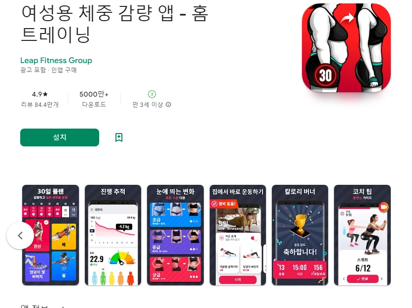 아래는 여성용 체중 감량 앱 - 홈 트레이닝 어플에 대한 스크린샷 정보입니다.