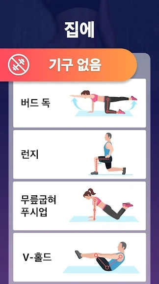 규칙적인 운동으로 주요 근육을 단련해 멋진 몸매를 만들어보세요. 헬스장 또는 값비싼 피트니스 트레이너가 필요 없습니다. 집에서 하는 간단한 운동으로 체중을 감량하세요!