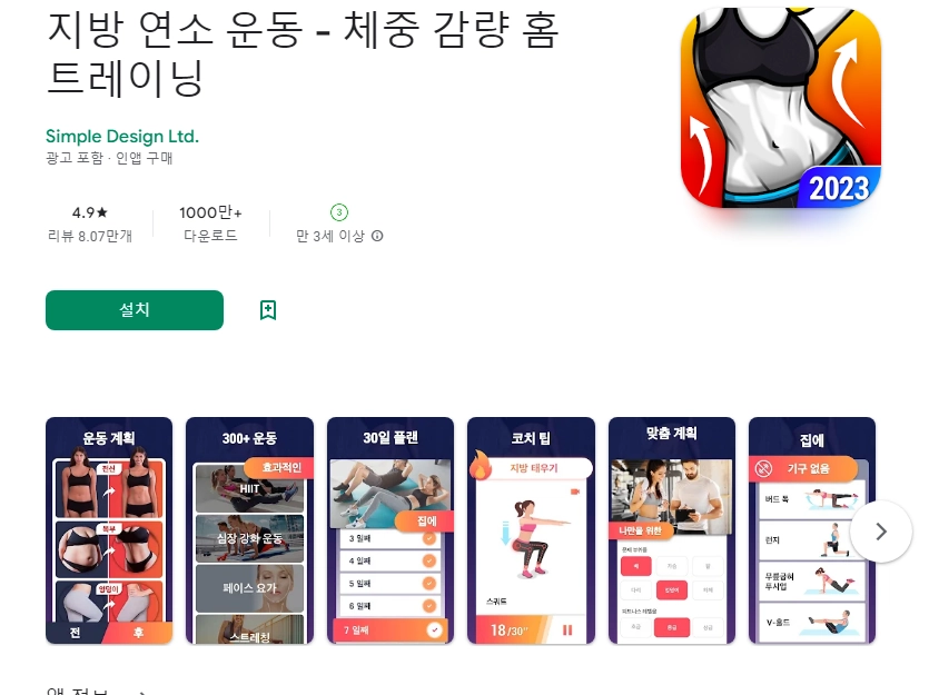 아래는 지방 연소 운동 - 체중 감량 홈 트레이닝 어플에 대한 스크린샷 정보입니다.