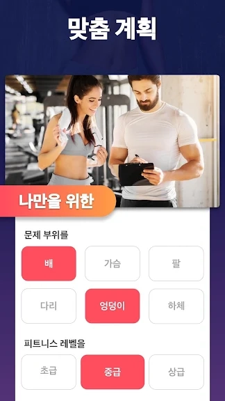 수백개의 운동 중 자신에게 딱 맞는 운동 루틴을 만들어보세요. 무릎이나 허리를 다친 경우, 걱정하지 말고 원하지 않는 운동을 다른 운동으로 바꿀 수 있습니다. 운동 순서 및 휴식 시간도 조정할 수 있습니다.