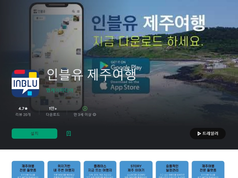 이 어플은 구글플레이스토어에서 "제주도 여행코스 추천"로 검색했을때 4번째로 나오는 어플입니다. 아래는 인블유 제주여행 어플에 대한 자세한 설명이니 참고하세요.