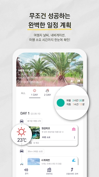 꼭 가야할 플레이스를 일정에 추가하면 이동시간을 자동으로 계산해드립니다.