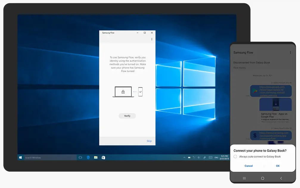 Samsung Flow는 태블릿/PC와 갤럭시 휴대폰의 연동을 통해 편리한 기능을 제공합니다. 1. 태블릿/PC 간편 인증 Samsung Flow에 등록이 완료된 Galaxy 휴대폰 인증을 통해 간편하고 안전하게 Windows 태블릿/PC