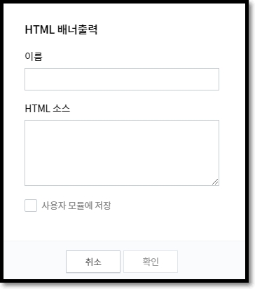 ▲ HTML 배너 출력 버튼을 클릭해보세요 그러면 위와 같이 나옵니다. 이름은 자신이 알아볼 수 있도록 적당한 이름을 넣으시면 될 것이고 HTML 소스 박스에는 애드센스 광고 코드를 삽입 하 신다음 확인 버튼을 누르시면 됩니다.
