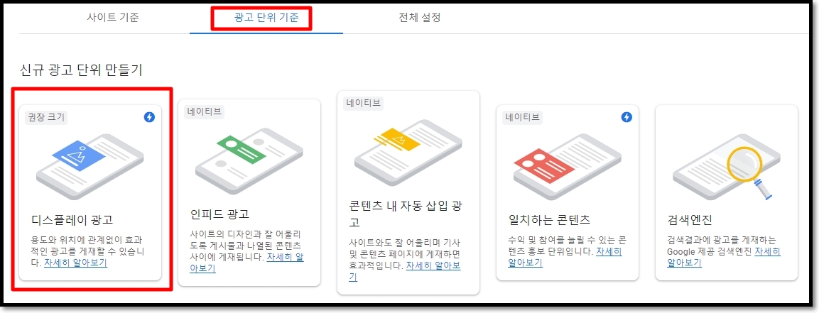 광고 종류에 대한 설명은 이 정도로 하고 이제 디스플레이 광고 코드를 생성하는 방법을 알아보겠습니다.
