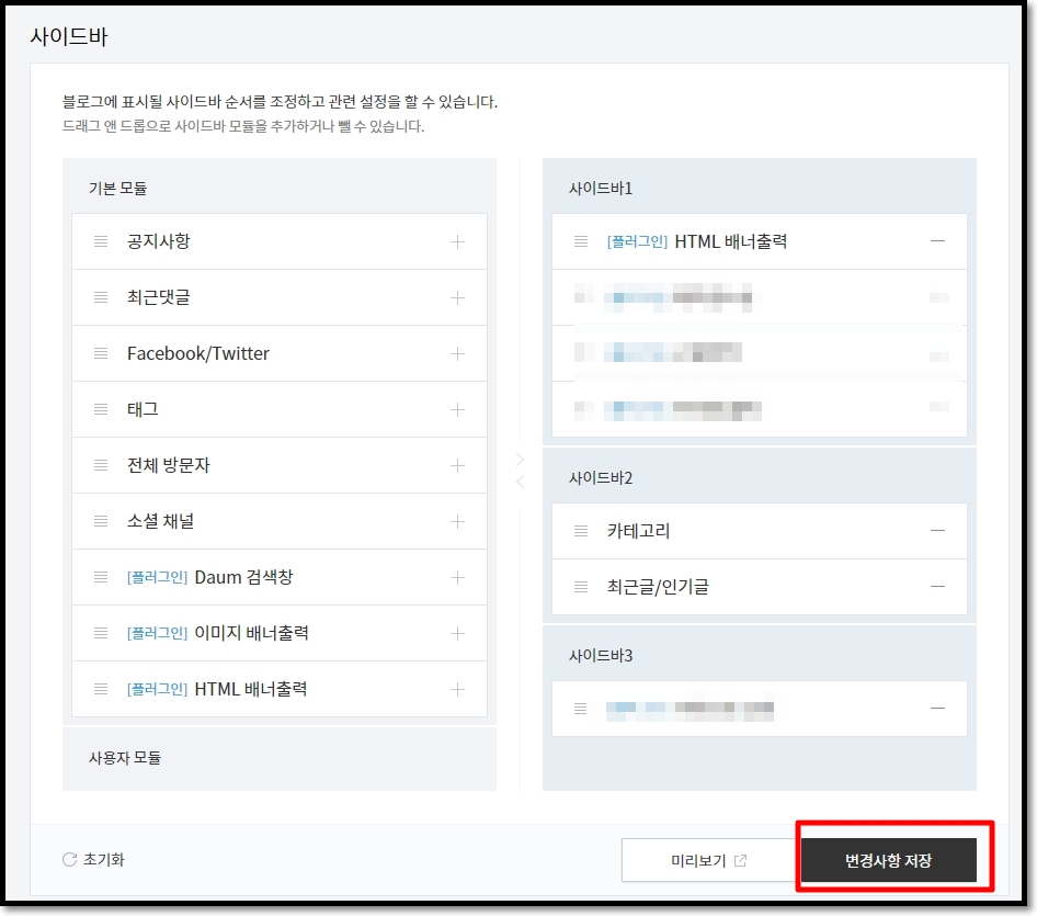 ▲ 그다음 HTML 배너 출력이라는 메뉴가 추가되어 있을 겁니다. 아까 플러그인 활성화해서 생긴 메뉴죠~ 클릭하 신다음 사이드바 1,2,3 중에 선택해야 하는데 상단에 넣어보도록 하겠습니다. 사이드바1을 눌러주세요