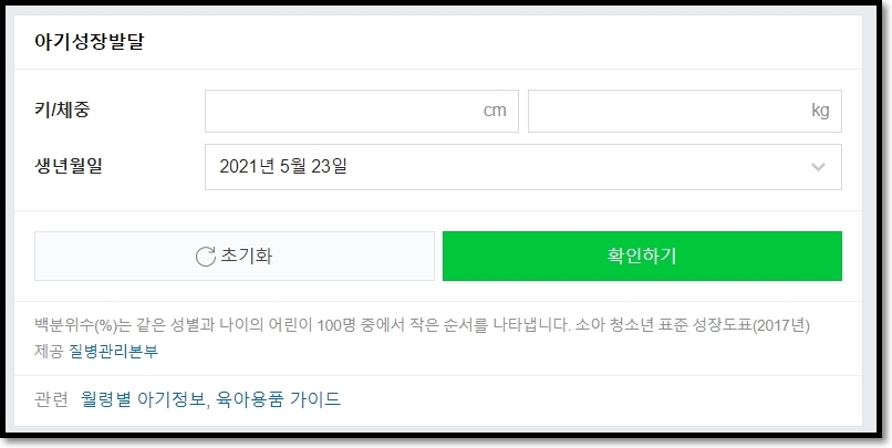 신생아(아기)의 키와 체중을 넣고 생년월일을 기입하시면 됩니다.