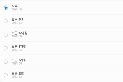 ※ 메시지의 경우 많은 메시지를 백업할 경우 백업시간이 길어지거나, 휴대전화 속도가 느려질 수 있습니다. 긴급 알림 메시지, 임시저장 및 전송 실패 메시지, 투폰 모드 메시지, iMessage 효과가 포함된 메시지는 백업할 수 없습니다. 백업 시 모두, 최근 2년, 최근 12개월, 최근 6개월, 최근 3개월, 최근 30일 중에 선택 후 백업할 수 있습니다.